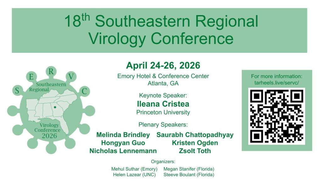 March 17th, 2026 — Pack your bags, the virologists in the Rivera-Serrano lab will be heading to Atlanta at the end of April for the Southeastern Regional Virology Conference (SERVC) + our first Lab Retreat! Dr. E will be presenting some of our research at the conference. #SquirtleSquad